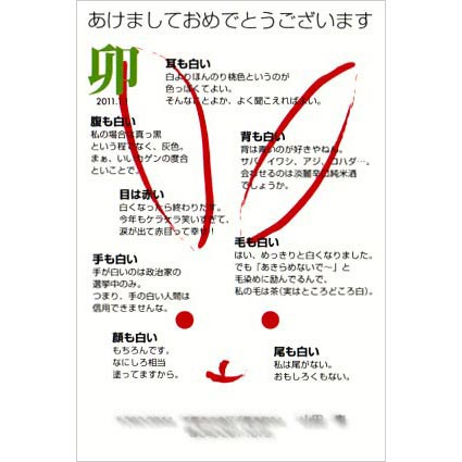 Nowadays, almost all cards are made with PC and we can seldom see handmade cards. PC makes it easier and more popular to print family photos on the New Year´s cards. Young parents are eager to show their babies, newly-married couples their wedding photos and pet loves take up their beloved animals. It is also usual to print Chinese zodiac using photo, illustration or calligraphy; 2011 for example is the year of rabbit. Mt. Fuji is also popular for New Year´s card, as seeing it at the year begin is believed to bring good luck. Much attention is paid to the visual effect of New Year´s postcard, but some people try to put as many letters as possible and inform about their life. Everybody has his own style.