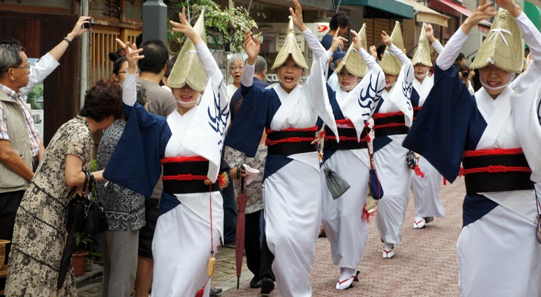 Awa-odori is a representative folk festival dance which is danced outside of its original festival. Another famous example is Yosakoi-odori, originally danced in Kochi, the neighboring prefecture of Tokushima. Nowadays, a variation form of Yosakoi-Soran-odori became the main attraction of the fold festival in Sapporo. Awa-odori and Yosakoi-odori compete with each other in attracting people.